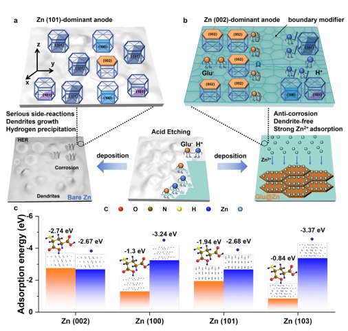 因其低成本、安全性高、理论容量较高等优点,水系锌金属电池(ZMBs)在大规模能量存储系统有巨大的应用前景。然而,锌负极在水系电解液中的热力学稳定性较差,容易发生锌枝晶、腐蚀等,是其商业化进程的严重阻碍。金属锌为密排六方结构,其电化学性能受其固有晶体学特征的影响,一方面,不同的晶面(如(100)、(101)、(002)和(103))在充放电过程中表现出显著不同的电化学活性;另一方面,晶界作为连接金属多晶体中晶粒的基本结构单元,其反应活性较晶粒内部更强,容易引发局部腐蚀,进而影响电池性能。因此,通过调控修饰锌负极的表面结构和晶界特性,实现更稳定的锌沉积和剥离,对于开发高性能ZMBs具有重要意义。