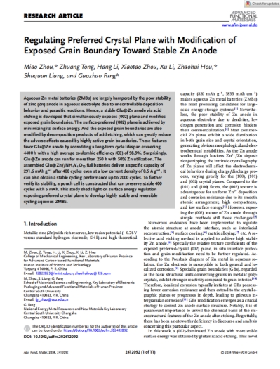 近日,公司先进碳基功能材料湖南省重点实验室侯朝辉教授、伟德国际1949周苗博士在开发高性能水系锌离子电池关键负极材料中取得新进展,研究成果以“Regulating Preferred Crystal Plane with Modification of Exposed Grain Boundary Toward Stable Zn Anode”为题发表于Advanced Functional Materials杂志(IF18.5,SCI一区TOP期刊,材料科学类JCR排名第一)。公司为该论文的第一完成单位,周苗博士为第一作者和通讯作者,侯朝辉教授和中南大学方国赵教授为共同通讯作者。
