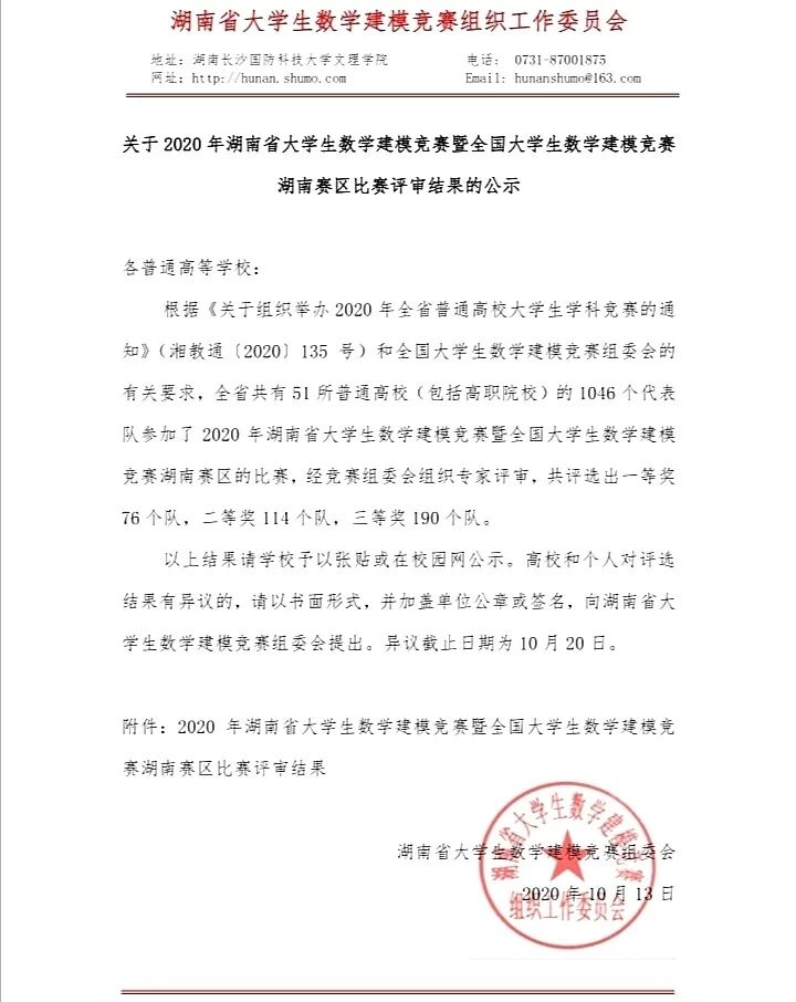 10月13日,2020年湖南省老员工数学建模竞赛暨全国老员工数学建模竞赛湖南赛区比赛结果揭晓,伟德国际1949组织的三支队伍从全省1046支队伍脱颖而出,全员获奖,其中一支队伍获得省一等奖,占全校省一等奖的50%,两支队伍获得省二等奖,占全校省二等奖的40%。