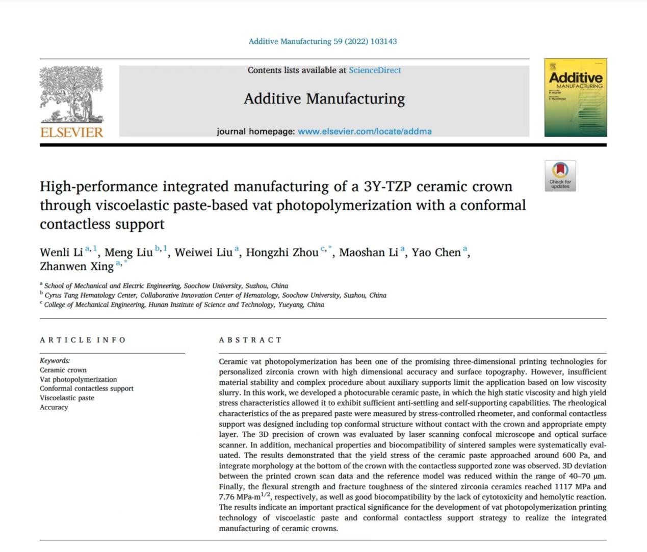 近日,公司周宏志教授在全瓷冠3D打印技术及评价方面取得新进展。研究成果以“High-performance integrated manufacturing of a 3Y-TZP ceramic crown through viscoelastic paste-based vat photopolymerization with conformal contactless support”为题发表于Additive Manufacturing杂志 (IF 11.632,SCI一区,制造工程类JCR排名第一)。
