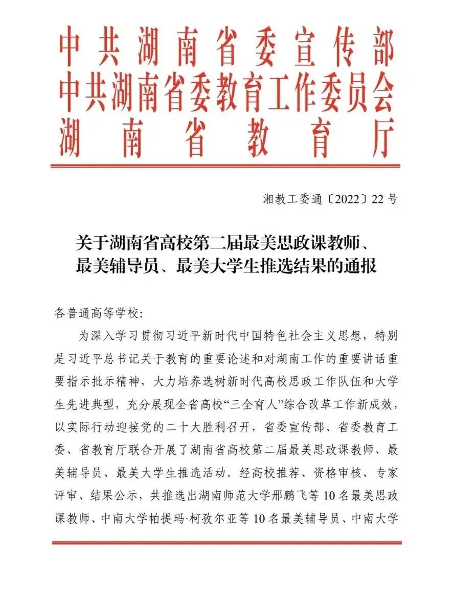 10月8日,“关于湖南省高校第二届最美思政课教师、最美辅导员、最美老员工推选结果的通报”公布,公司19级机自三班李宇曦同学获湖南省“最美老员工”称号,为公司获得此项荣誉的第一人。