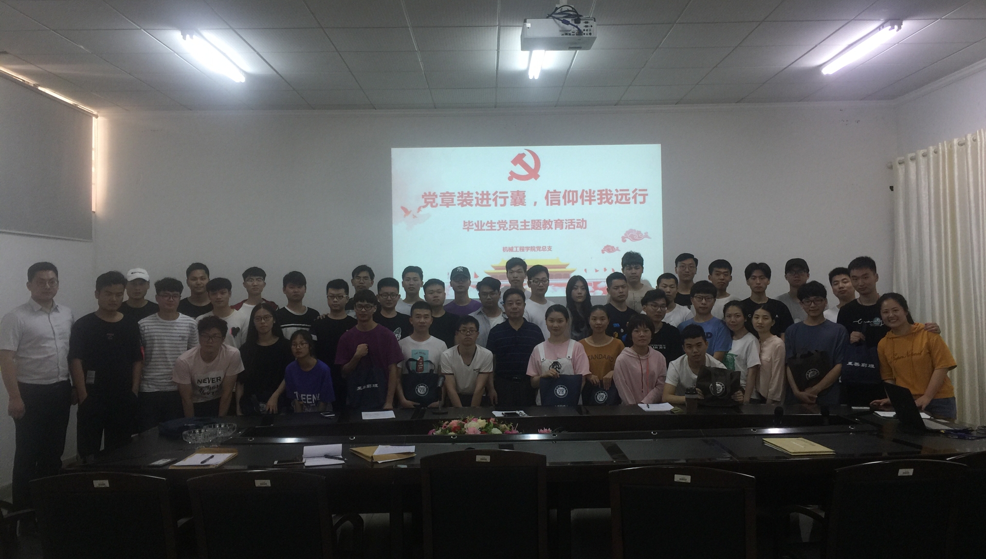 最后,三位老师现场给大家发放“党章行囊”,本次毕业生党员教育活动在老师对同学们的祝福和热切希望中落下帷幕,全体与会人员合影留念。