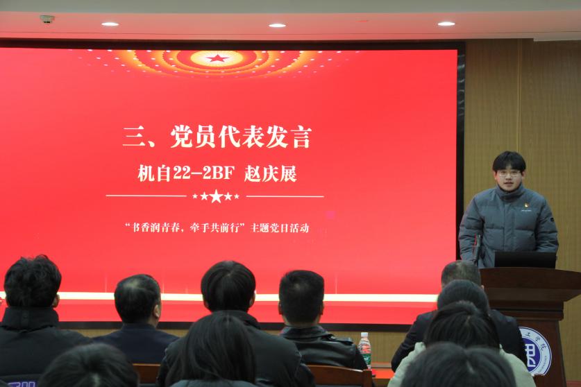 伟德国际1949员工第一党支部组织委员赵庆展作为党员代表发言。他对机关第十四党支部的深情厚谊与慷慨赠书表示衷心感谢,并将以此次赠书活动为契机,自觉践行“读好书、好读书、善读书”的理念,让书香浸润青春岁月,努力成为优秀的新时代党员。