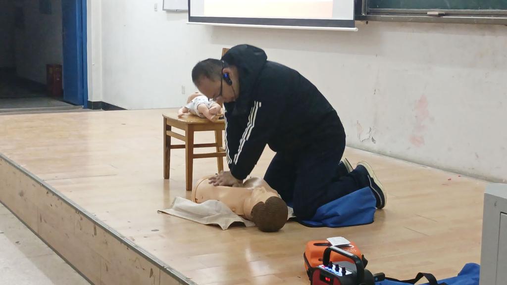会议伊始,黄杨槟通过相关网络媒体视频引入主题,详实地列举了各类突发情况,强调了学习应急救护知识的必要性和重要性,同时以案例为引导,为同学们详细讲解了面对突发心脏骤停情况时的应对措施:要先从意识、呼吸、心跳判断患者是否需要进行心肺复苏,然后严格按照心外按压、开放气道、人工呼吸三个步骤次序进行心肺复苏流程。最后,他借助AED等医疗设备邀请同学上台进行手把手指导教学,让同学们可以在实操中掌握最科学的急救方法。