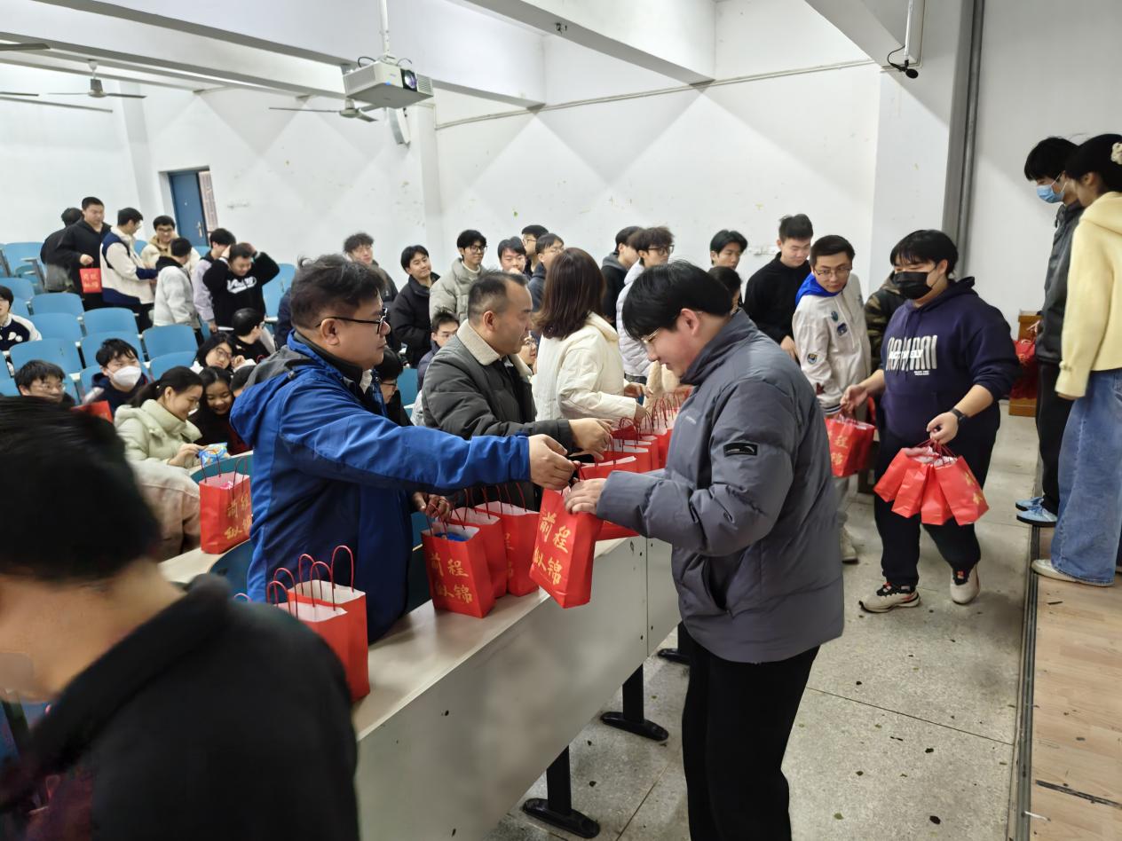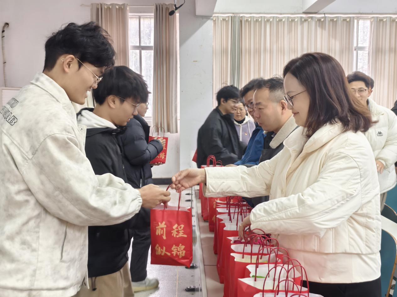 现场还为考研学子们送上了精心筹备的“考研慰问礼包”。礼包内不仅有寓意“前程似锦”的定制礼品袋,更有补充能量的士力架、薯片,驱散寒意的暖宝宝,以及象征“心想事成”的橙子等贴心好物。每一份慰问品都承载着公司对学子们的深切关怀与美好期许,让寒冬中的备考之路暖意融融,也让同学们感受到了来自公司大家庭的强大支持与温暖力量。