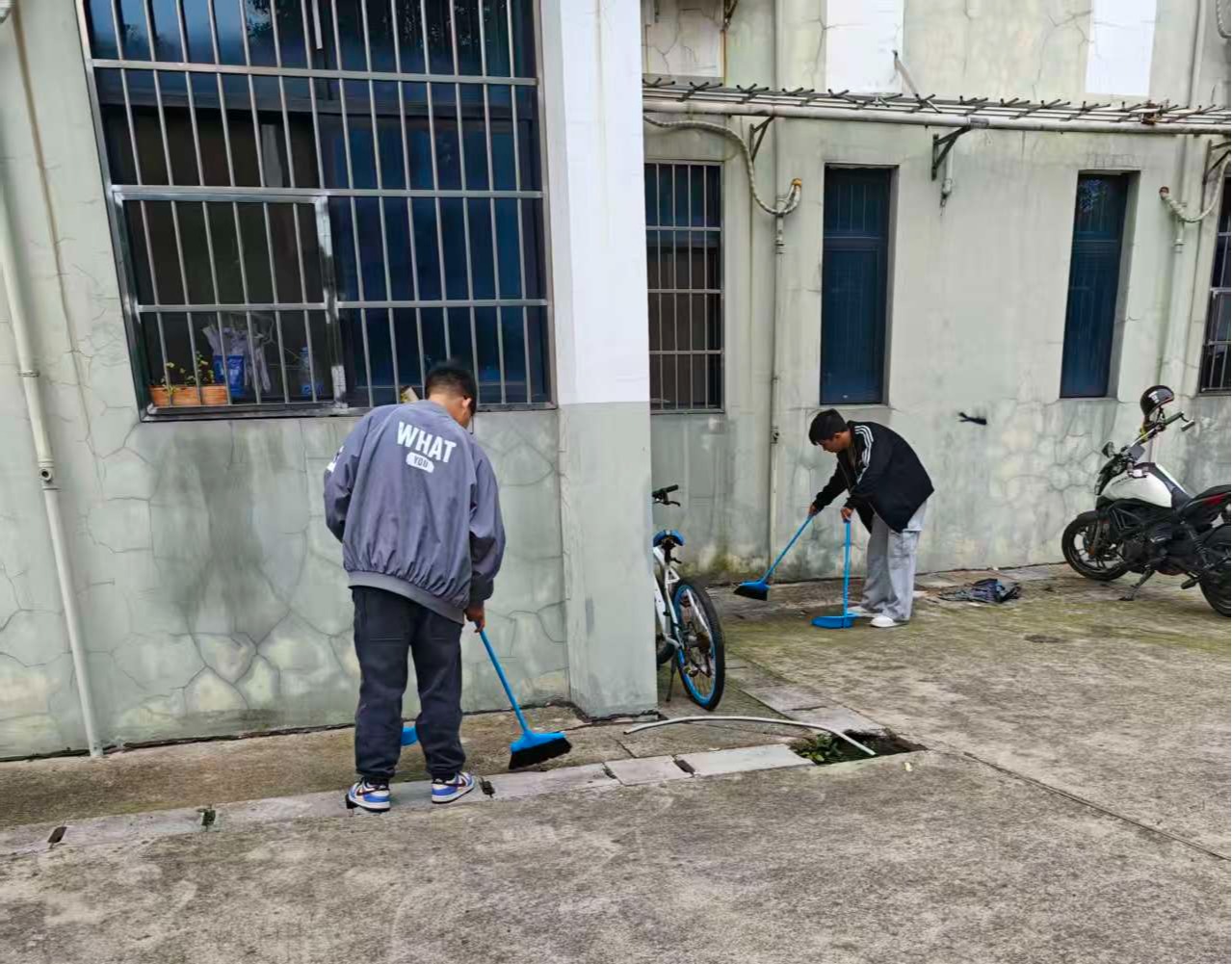 每周二和周五是固定的劳动日,新生们以班级为单位分组行动,迅速投入到各个责任区域。在16号、18号教学楼内,同学们分工协作,有的细致清扫教室地面的纸屑与灰尘,有的认真擦拭黑板、讲台及课桌椅,有的对多媒体设备、门窗玻璃等进行全面清洁,不放过任何一个卫生死角;在教学楼周边及20号宿舍楼周边区域,大家手持工具,有条不紊地清理绿化带内的杂草、枯枝和白色垃圾,规范摆放乱停乱放的共享单车,细致擦拭公共区域的栏杆与指示牌。劳动过程中,同学们热情高涨、默契配合,不怕脏、不怕累,汗水浸湿了衣衫却依旧干劲十足,现场呈现出一派热火朝天的劳动景象。辅导员全程跟班指导,及时解决劳动中遇到的问题,与同学们一同参与劳动,营造了师生同心、共建美丽校园的良好氛围。