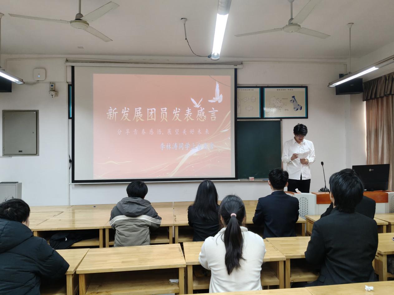 新发展团员代表李林涛上台发言。他分享了自己在专业学习中追求进步、在志愿服务中锤炼品格的成长历程,表达了加入共青团的激动心情与坚定决心。他承诺,将始终紧跟党的步伐,深耕机械工程专业知识,苦练专业技能,积极投身智能制造、装备研发等领域的实践探索,主动参与志愿服务与社会实践,以实际行动践行“请党放心,强国有我”的青春誓言,努力成长为有理想、敢担当、能吃苦、肯奋斗的新时代机械工程专业青年。