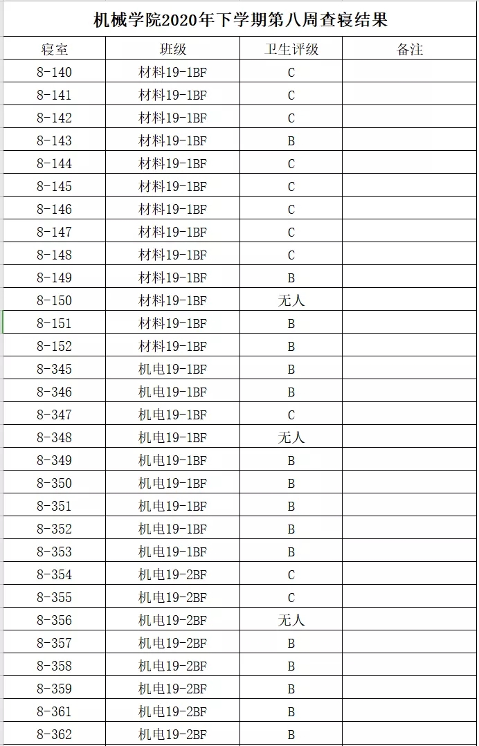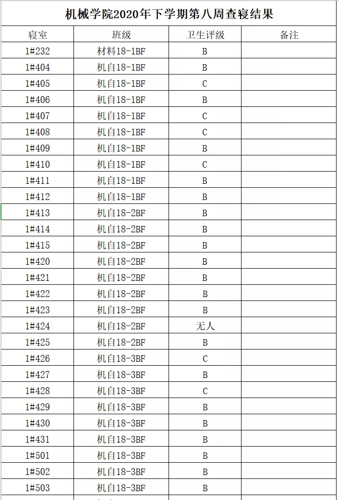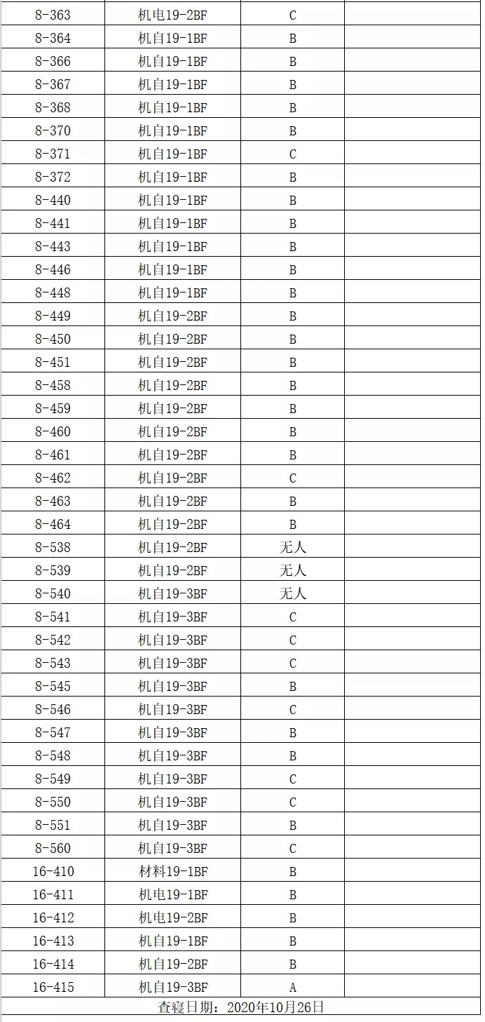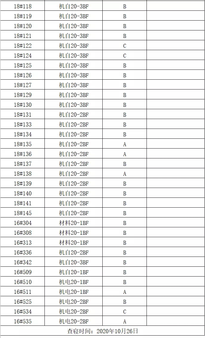 为维护公司正常的教学、生活秩序,同时给同学们提供一个优良的学习环境及干净、舒适的寝室环境。本周一(11月2日)20:00,由伟德国际1949团总支员工分会生活部、权安部与2020级各班生活委员组成检查小组,对公司2020、2019、2018级员工寝室进行了检查。检查的主要内容有:寝室卫生、物品摆放情况,违规电器的使用情况及寝室文化建设。 本次查寝共查寝室244间,其中优秀寝室11间,良好173间,合格49间,不合格1间,寝室无人10间。现将寝室检查结果公布如下: 优秀寝室展示: